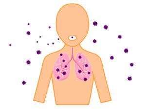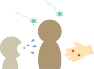 病原菌が空気中に飛び出し人に感染させることです。感染の恐れのある距離は1m以上とされています。
