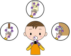 外から帰ってきた時、食事の前やトイレ後などは必ず手を洗うようにします。料理の提供者も料理をする前には指の間や指先から手首にかけて念入りに洗います。うがいは、はじめは口の中からのどを洗えるよう、「くちゅくちゅ」と「ガラガラ」うがいの両方をします。
